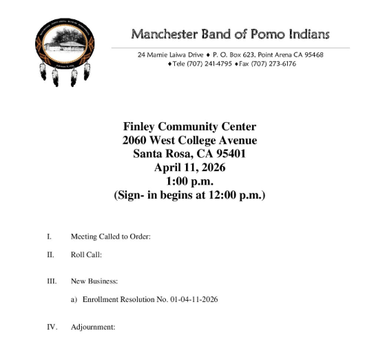 Manchester Band of Pomo Indians – Community Meeting Notice